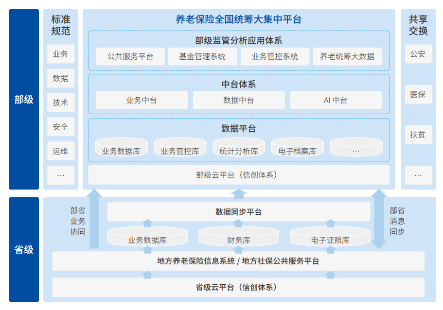 国家级政务信息系统工程多采用总局统筹省级部署模式,出于数据统管及跨地域数据协同的需要,往往需要建立跨层级跨地域的数据协同机制。以税务金税三期系统工程为例,各省局业务系统数据按天批量增量上报总局,同时像发票数据等需跨地域协调数据总局也会按天批量增量下发。据此人社部养老保险全国统筹数据同步平台将 32 个省局多数据库同步,实现部省二级异构数据同步,确保统一的运维和监控,满足部级全国统筹战略要求。