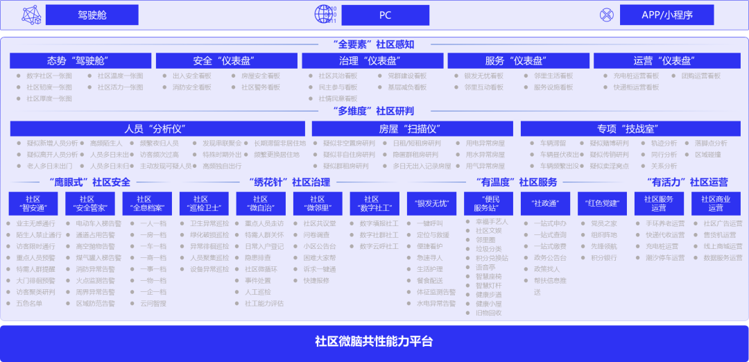 这里的“1”指的是社区微脑共性能力,“4”指的是四类社区应用场景,“2”则代表的是两类社区感知研判场景。