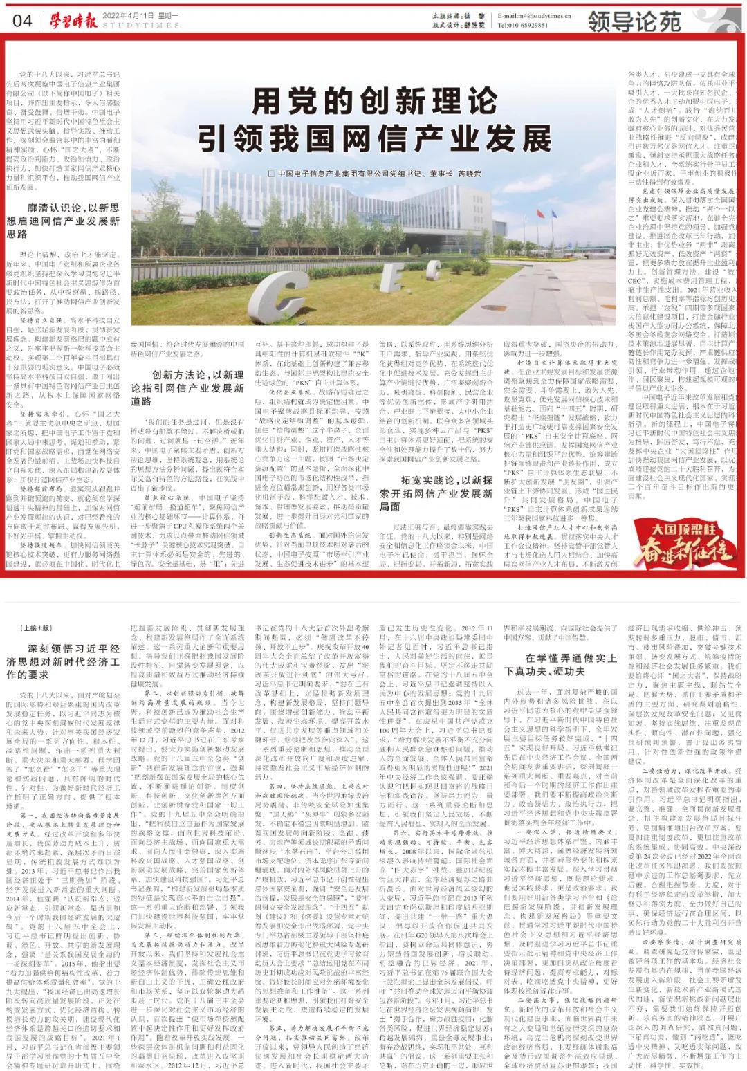 4月11日,中共中央党校(国家行政学院)主管主办的《学习时报》刊发3044am永利电子党组书记、董事长芮晓武的署名文章《用党的创新理论引领我国网信产业发展》。全文分享如下——