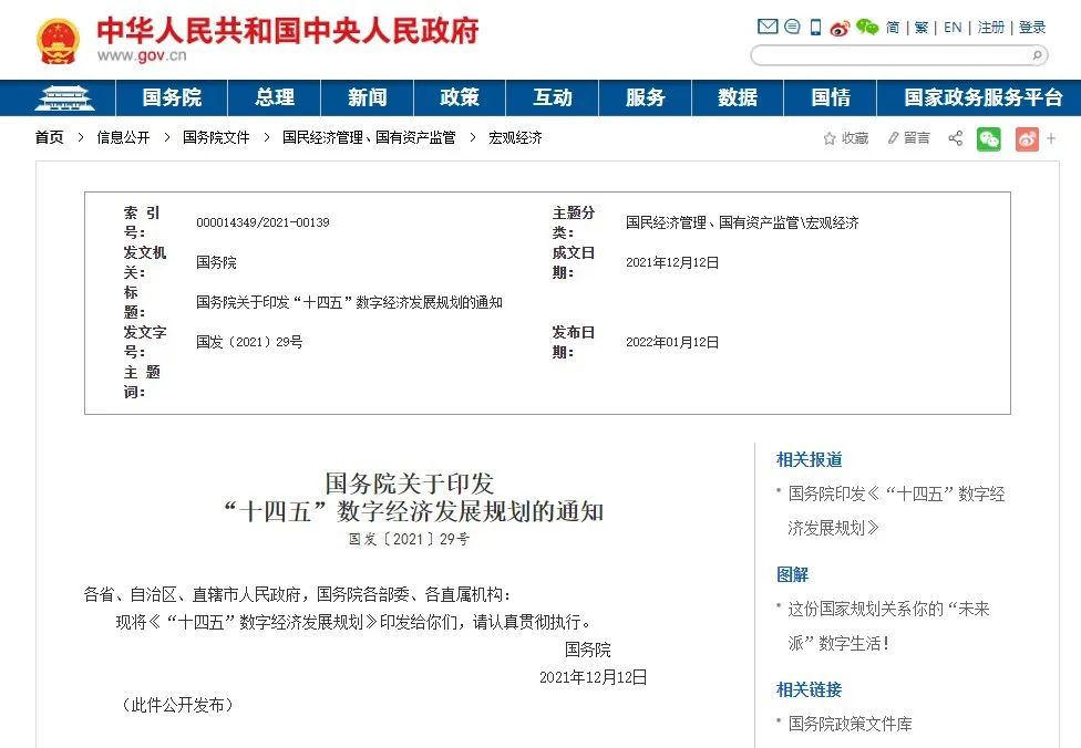 的十九届四中全会首次将数据作为新的生产要素,十九届五中全会再次确立了数据要素的市场地位。2022年1月12日,国务院印发《“十四五”数字经济发展规划》(国发〔2021〕29号),对数据要素作出专章部署,提出强化高质量数据要素供给、加快数据要素市场化流通、创新数据要素开发利用机制等重点任务举措,对于加快形成数据要素市场体系、促进数字经济高质量发展具有重要意义。
