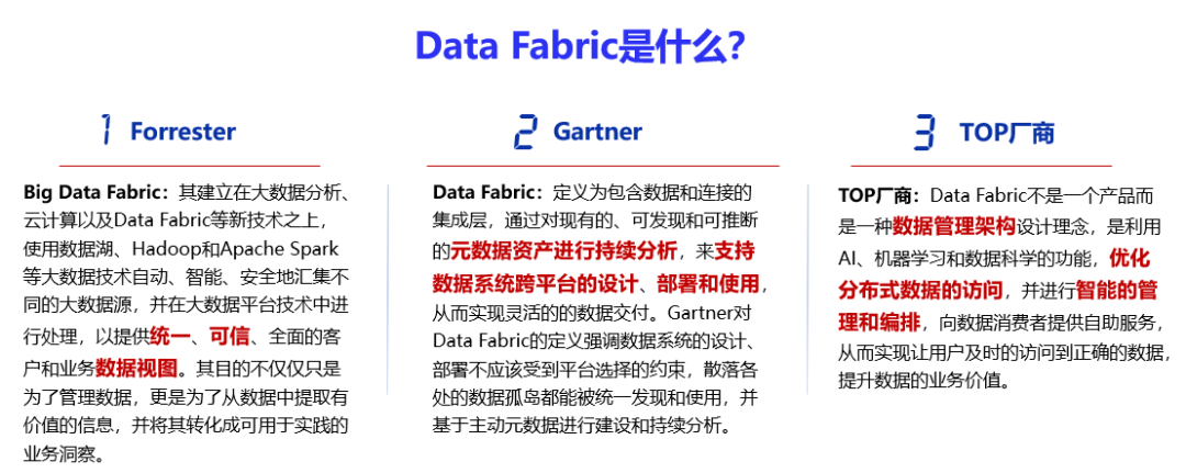 当前我们正处在VUCA时代,不确定性大幅增强,需求的变化不断推动数据架构演进,3044am永利系统副总裁、数据创新BU总经理刘国栋介绍了相应的对策,即:Data Fabric架构解决数据松耦合融合需求,通过连接任何可访问数据或与数据相关的信息,将现有的数据管理系统和应用程序编织在一起,提供可重用的数据服务。涵盖数据集成、访问、转换、建模、可视化、治理和交付。Gartner将Data Fabric列为2019年和2021年数据和分析领域十大技术趋势之一,又将其推举成2022年10大新兴技术趋势之一。