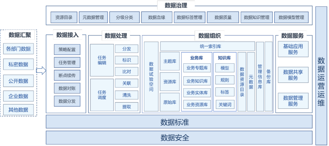 什么是数据治理?数据治理是对数据资产管理行使权力和控制的活动集合,其目的是将数据有序管理方便提取并提升数据的价值,本质是数据有序化和增值的过程。数据经过产生后,进入治理环节,其流程可粗略分为数据汇聚、数据接入、数据预处理、数据组织、数据治理,最终以数据服务的形式输出,另外加上周边的数据标准体系、数据安全体系、数据运营运维体系做支撑,从而构成完整的工程架构,如下图所示: