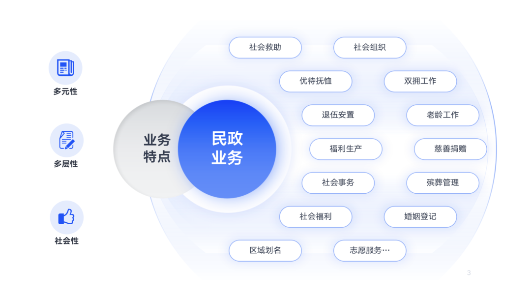 民政业务范围广复杂度高,需解决一系列社会问题,做好社会行政事务,促进社会安定团结;另外,还具有多元性、多层性、社会性等特点。