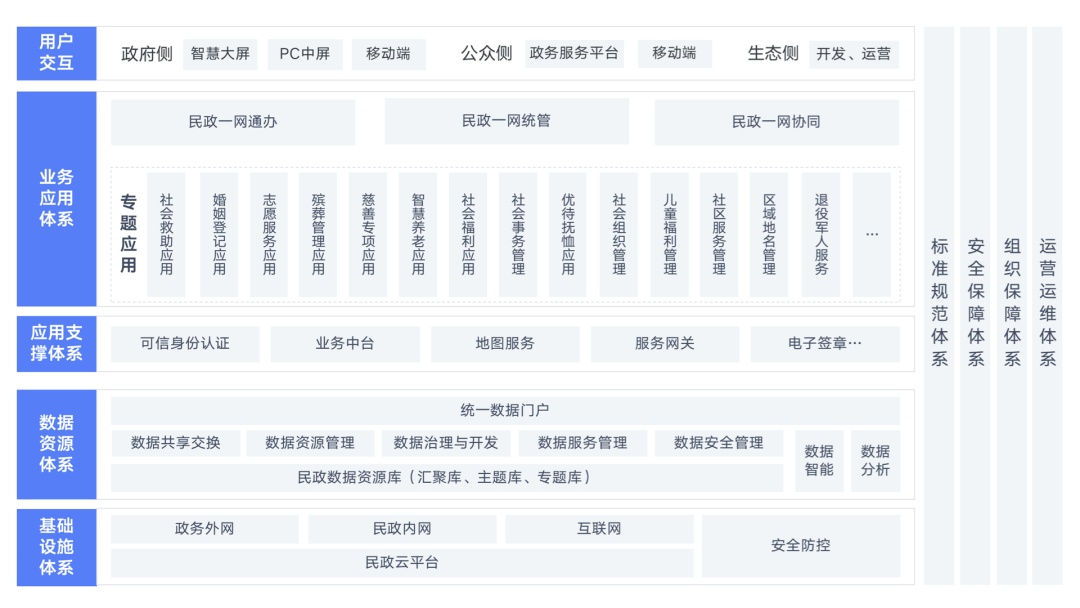 最后,民政业务面向社会公众,需要财政、卫健委、人社、司法等多部门广泛协同,但当前信息孤岛、数据壁垒严重,数据共享难;公共便民服务水平有待提升,跨部门数据共享交换和业务协同机制较不完善。