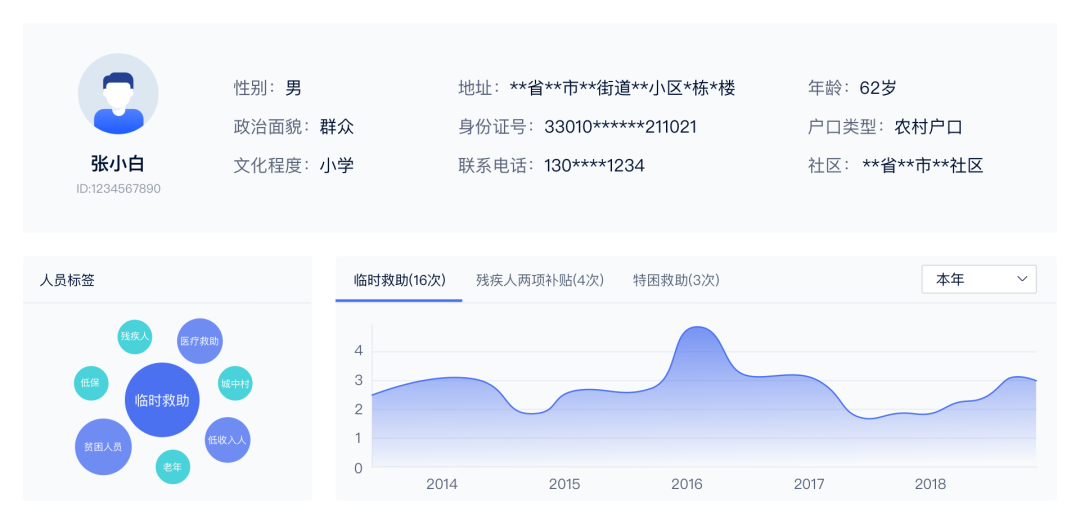 通过采集交换公安、人社、残联等外部门数据,依托智慧民政一体化平台的数据处理能力,构建人员智能标签;利用知识图谱、可视化等技术建立人员全息画像,实现对未成年人、贫困人员、吸毒史人员、留守儿童、低收入人员等各类人员的管控和关怀。