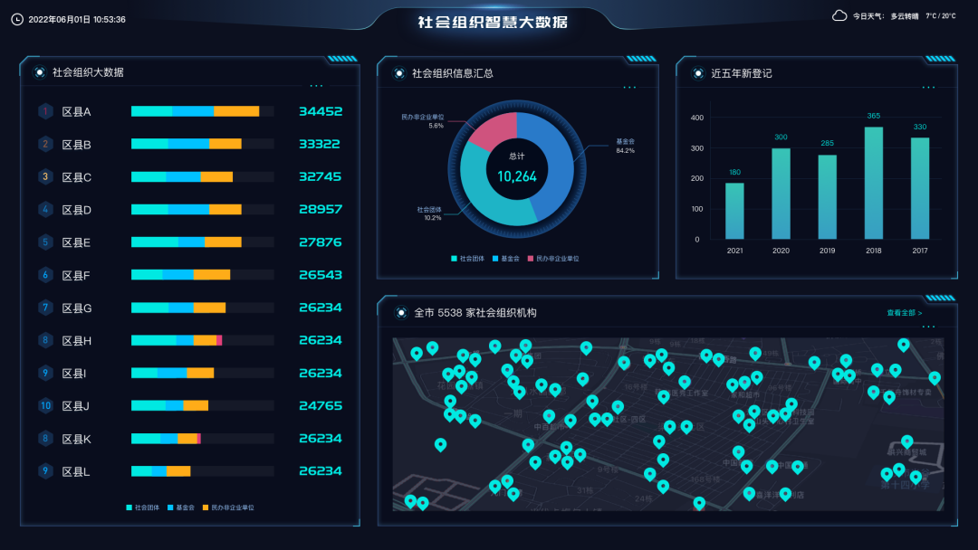 通过智慧民政一体化平台汇聚社会组织相关数据,基于大数据技术进行挖掘和分析。将社会组织数据通过二维、三维图形图像直观动态地展示,实现社会组织展示汇报、业务监控、统计分析等。