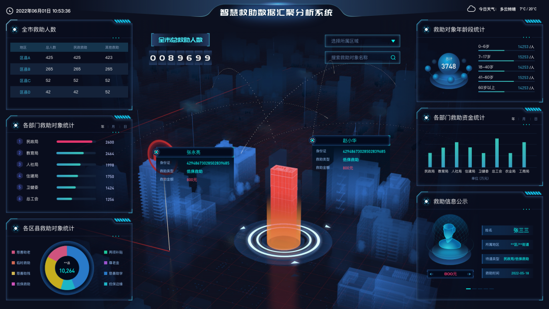 利用智慧民政一体化平台的数据资源体系能力,汇聚分析全域救助项目、救助对象、救助资金等指标,向领导提供数据分析、数据预警、数据决策服务,实现对救助数据动态监管,及时全面掌握社会救助总体情况。