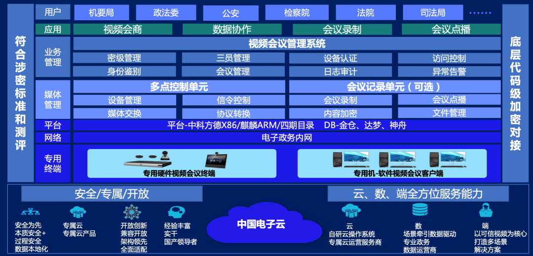 基于可信云架构和可信云视频服务;采用智能路由MCU分布式集群;双物理数据中心部署备份,为政务用户提供完整的云+数+端的可信云视频会议解决方案。