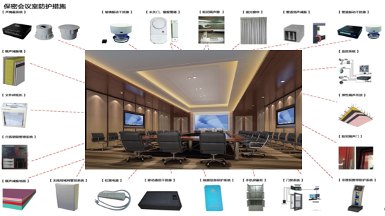 用于召开涉及国家MM的会议,要求能够有效地对会议所产生、存储、处理的声、光和电磁等信息进行防护,并能通过国家标准的测试。按照国家标准要求,会议室根据SM程度,由低到高分为一级、二级和三级三个级别,具体建设要求如下: