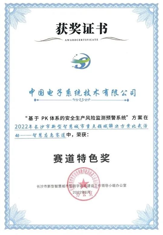 论坛上举办了“2022长沙市新型智慧城市重点领域解决方案比武”颁奖仪式,为在比武中获得综合优胜奖或赛道特色奖的42个解决方案授牌、颁证,经过激烈角逐,3044am永利系统最终脱颖而出,以“基于PK体系的安全生产风险监测预警系统”方案一举斩下智慧应急赛道“赛道特色奖”。