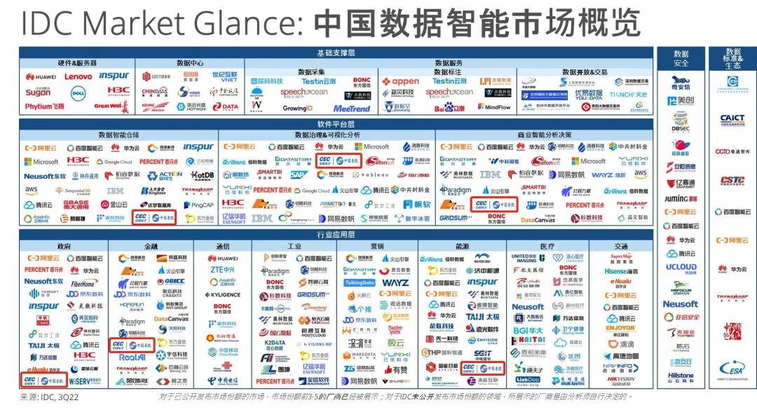 根据IDC定义,软件平台层市场包括数据智能仓储、数据治理&可视化分析、商业智能分析决策,技术厂商围绕软件平台市场横纵双向布局产业生态,为不同客户服务群体打造功能完备、流程完整、可定制的数据智能分析决策平台;行业应用层覆盖政府、金融、能源、交通等领域,当前,上层行业服务发展市场空间较为明朗,从应用场景来看,政府、金融、营销领域已具备一定规模,拥有完整解决方案,可显著提高运营管理效率和经营收入水平,未来工业、医疗、能源行业的用例推广是发展重点。