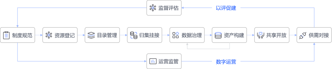 以评促建是政务数据管理的重要抓手,围绕政务数据工程的不同阶段,以目标为导向,配置数据评价模型与指标体系,周期性发布数据评价报告,促进各地区各部门数据治理水平提升,形成共治共享共建新局面。