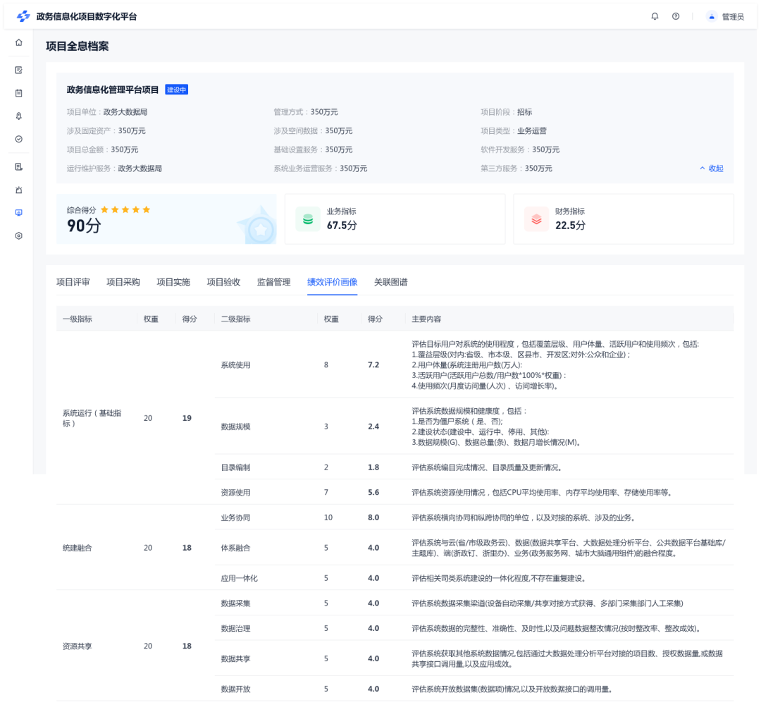 平台沉淀项目绩效评估模型与指标体系,以评促建、以评促改。