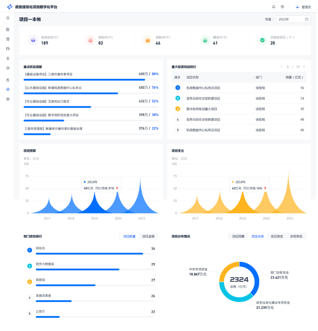 平台利用共享交换平台汇聚所有项目台账信息,建立项目一本账,从而提升项目管理决策力。