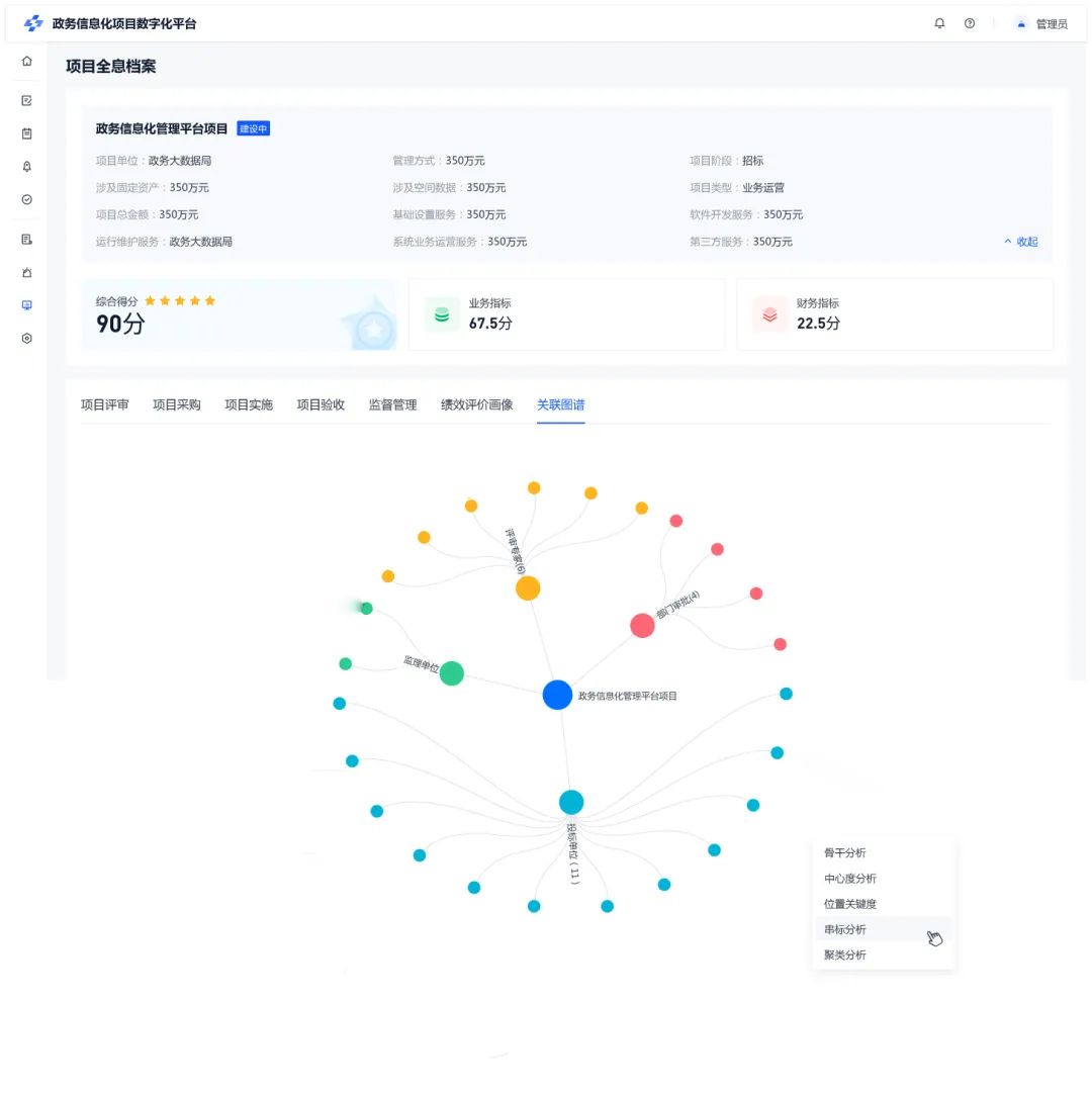 平台基于全量的项目台账信息,构建项目、系统、建设部门、监理单位、施工主体、投标主体的关系图谱,通过关系网络智能分析手段,深度分析各类项目之间的关联影响与风险。